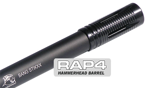 The Hammerhead Barrel is the most technologically advanced paintball barrel in the industry. Our purpose was to develop a paintball barrel to achieve strict accuracy and guarantee a 99% ball break for law enforcement for pepper balls. This is a rifled barrel with a ‘spiral’ pattern inside it to put a spin on the paintball when it comes out; this greatly increases your distance and accuracy.