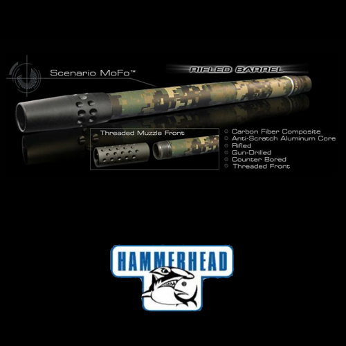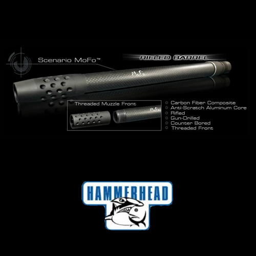 The composite product produces a barrel of superior strength when compared to mono-carbon fiber barrels while providing the advantage of being light weight. The MoFo barrel is ported and counter-bored for stabilization of the pressure wave in front of the ball and control of air turbulence at the muzzle exit. MoFo comes in multi-colors including our new CAMO finish. Its compatible with the standard Hammerhead sizer system. The barrels are interchangeable with all other fins and ball sizers produced by Hammerhead.