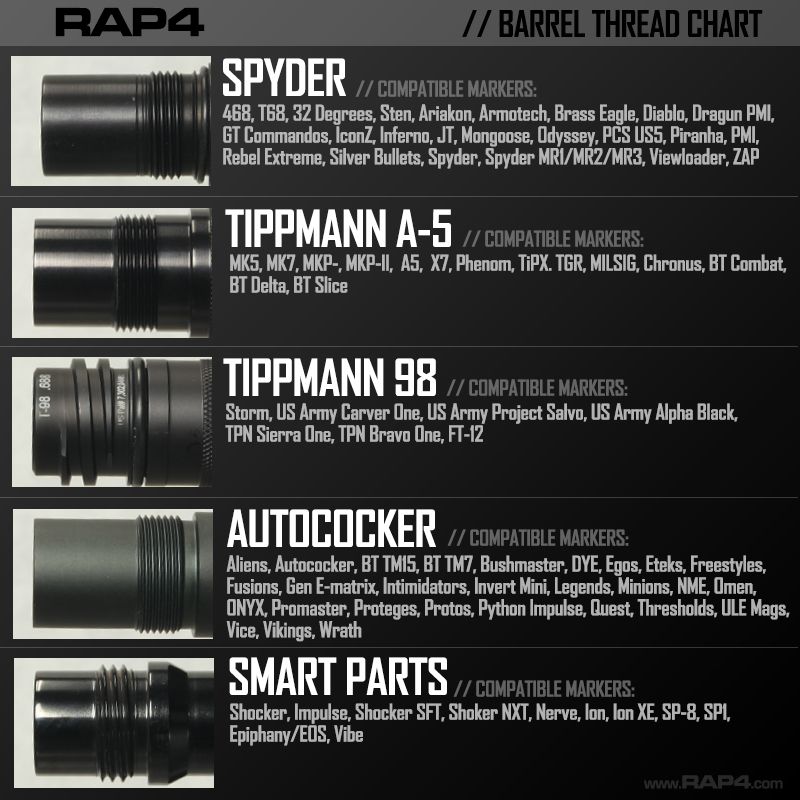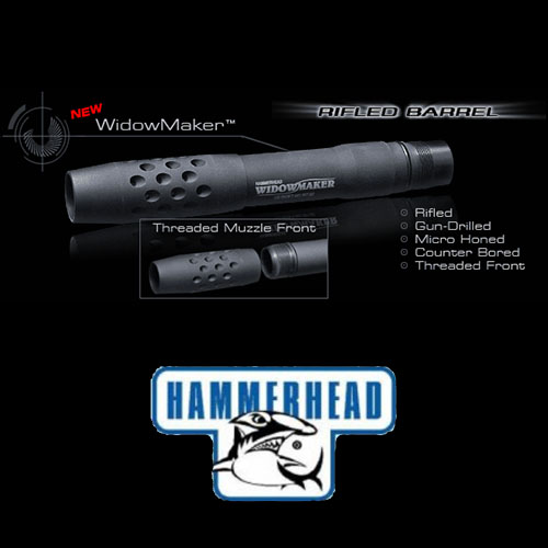 The WidowMaker is a military style, 8″ rifled gun-drilled barrel specifically designed for woods and scenario paintball. The barrel accepts a sizer that can be threaded for most all markers including Phenom, X7, BT products, Spyder, A5,T98,Cocker, Impulse,Ion, and the muzzle can accept a Hammehead “Link” for adapting to a Bangstikxx® or a Battlestikxx® to combine to make an extra-long sniper barrel. The muzzle of the Widowmaker, will accept all of the Hammerhead muzzles including the M-50,Battlestikxx®, Bangstikxx®, Snaggletooth®, and the reverse ported Magnesium muzzle.