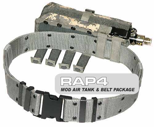 Combination belt and tank pouch. Get this combo in case you don’t have a paintball vest or if you have a vest that’s not compatible with the air tank pouch. The tank uses the MOLLE system to attach and is compatible with all other MOLLE systems.