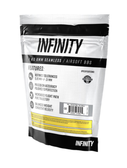 The Infinity 0.30g airsoft BBs are precision 6mm plastic BBs from Taiwan that are highly polished and seamless BBs for 6mm airsoft rifles and airsoft pistols. Their ball bearing quality precision gives the flight path greater accuracy and consistency. The Infinity airsoft BBs are packaged in a 1 kilogram resealable bags. We recommend our Valken M4 Magazine Style BB Speed Loader for use with Infinity BBs when loading mid-cap magazines.