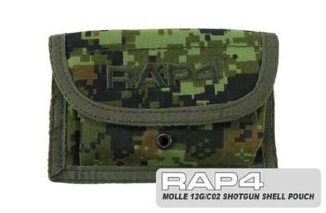 This pouch fits on a tactical paintball vest. It is designed to carry two shotgun shells. It can also carry 12g disposable CO2 cartridges.