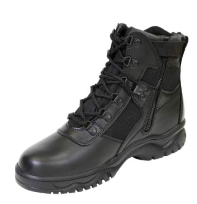 Rothco 6 Inch Waterproof and Blood Pathogen Resistant Tactical Black Boot features Leather & Nylon upper with waterproof and blood borne pathogen membrane which protects the wearer from blood-borne pathogens and moisture. Rothco’s blood pathogen resistant boot also features a moisture wicking lining to ensure optimal comfort and dryness. The side zipper with hook & loop zipper keeper tab was strategically designed so that the boots can be put on and off quicker than the traditional lace-up military boots. Additional features of the boot include removable insoles and gusseted tongue for additional comfort, steel shank and D-ring eyelets. The slip-resistant cup sole provides maximum grip. These features make these durable, comfortable, high quality tactical boots great for police, and other law enforcement agents, and private security guards. They are also great boots for scenario paintball, outdoor woodsball, and airsoft training. While being made from high quality materials such as real leather and having some of the best features in tactical footwear these Rothco boots are inexpensive when compared to boots of similar quality. Rothco’s 6″ Black Leather and Nylon Waterproof and Blood Pathogen Resistant Tactical Boots are on sale here at our top-rated and affordable paintball and airsoft shoes and apparel store at the best possible cheap discount online sales price.