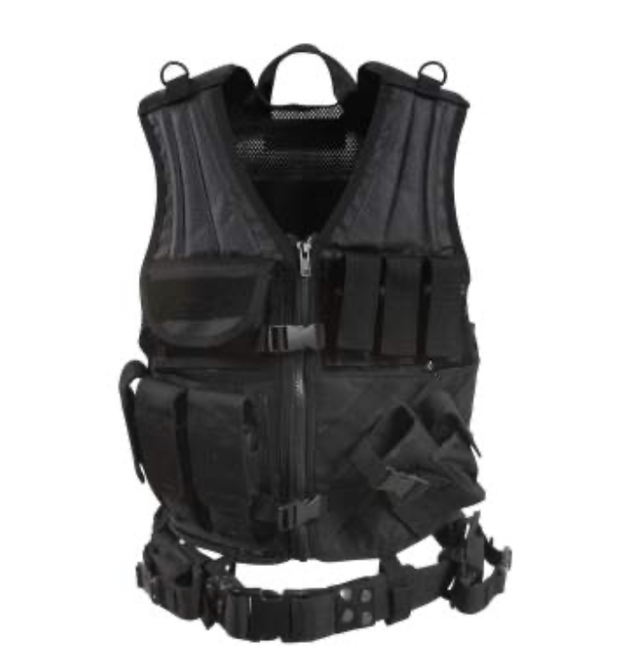 Rothco’s Tactical Cross Draw MOLLE Vest is constructed with a heavyweight polyester mesh. Features include 3 ammo pouches, 3 pistol magazine pouches, M.O.L.L.E. attachment fields, padded shoulders, 2 D-rings, 2 inside zip-up document pouches, adjustable pistol belt, carry handle, hook & loop adjustable shoulder straps, drawstring waist and a removable holster. Rothco’s tactical vest is available in Regular sizes (Small – X-Large) and Oversized (2XL/3XL). This cool, high quality vest is great for police and other law enforcement, military personnel, as well as paintball and airsoft.