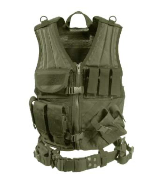 Rothco’s Tactical Cross Draw Vest is constructed with a durable heavyweight polyester mesh. Features include 3 ammo pouches, 3 pistol magazine pouches, M.O.L.L.E. (Modular Lightweight Load-Baring Equipment) attachment fields, padded shoulders, 2 D-rings, 2 inside zip-up document pouches, adjustable pistol belt, carry handle, hook & loop adjustable shoulder straps, drawstring waist and a removable holster. Rothco’s high quality combat ready tactical customazable vest is available in Regular (Small – X-Large) and Oversized (2XL/3XL). This heavy duty army grade olive green drab vest is perfect for military, law enforcement, private security, contractors, scenario paintball, outdoor woodsball, airsoft, hunting, fishing and other outdoor activities. This cool, durable, tactical adult men’s and women’s supplies vest is on sale here at our top-rated and affordable paintball gear and airsoft supplies store, at the best possible cheap discount online sales price.