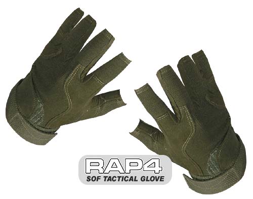 SOF Tactical Open Finger Glove is the revolutionary new line of Tactical Paintball Gloves designed for the Military and Law Enforcement. Made of genuine leather and high-durability fabric treatments, they offer super heavy-duty stitching, rugged construction and advanced ergonomic design. This top rated 3/4 finger army style paintball gloves are best for outdoor woodsball and scenario paintball. The open finger design of these high quality and durable paintball gloves makes them very versatile. The top rated RAP 4 SOF Open Finger Tactical Paintball Gloves are available in Green, Black and Tan and are on sale here at our paintball gear and supplies store at the best possible cheap discount online sales price.