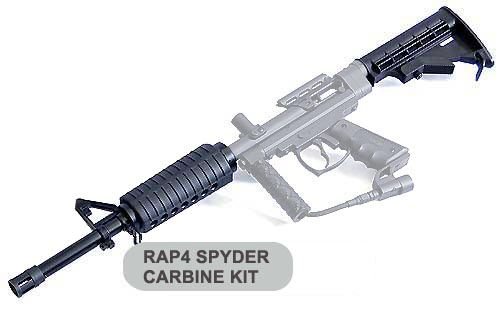 The Spyder M4 Carbine Kit is a Realistic Tactical Carbine Parts Kit For most Kingman Spyder Paintball Guns! Includes easy to install, authentic carbine handguard and adjustable stock to transform several different Kingman Spyder paintball markers into realistic, accurate tactical rifles.