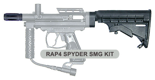 The Spyder SMG Kit Quickly Transforms Almost any Kingman Spyder Paintball Marker into a Realistic Sub Machine Gun. This easy to install Spyder paintball gun parts kit includes authentic carbine stock and 3” SMG barrel for a fierce, compact look.