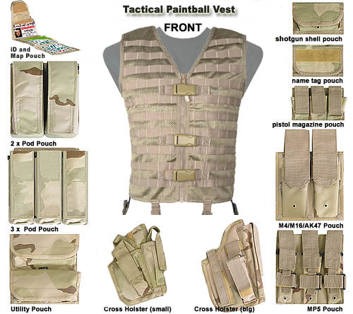 The Tiberius Tactical paintball vest is designed for the player who loves to play with the Tiberius T8 or T8.1 paintball pistol. This tactical vest is equipped to carry 3 Tiberius Arms T8 pistol magazines and of course the Tiberius .68 caliber pistol. The pistol holster will also hold any of the large .68 caliber pistols, including the T68, Ariakon and Desert Eagle (.43 caliber) and the magazine pouch will carry their clips.
