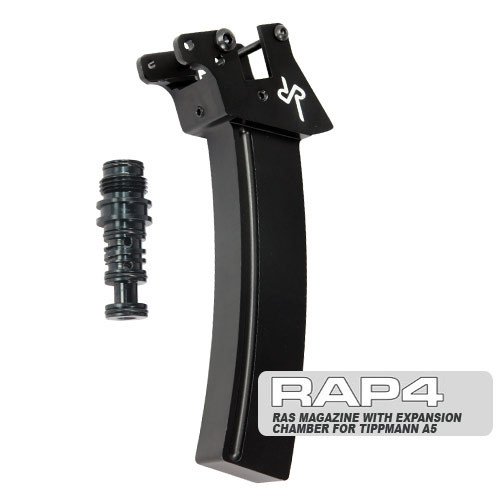 The Tippmann A5 RAS Magazine Expansion Chamber will not only improve the performance of you gun, but will give your A5 an awesome tactical look. Turn your paintball marker into a war machine with this Magazine 4 Chamber Expansion System. Dress up your Tippmann A5 like an RAS sub machine gun!