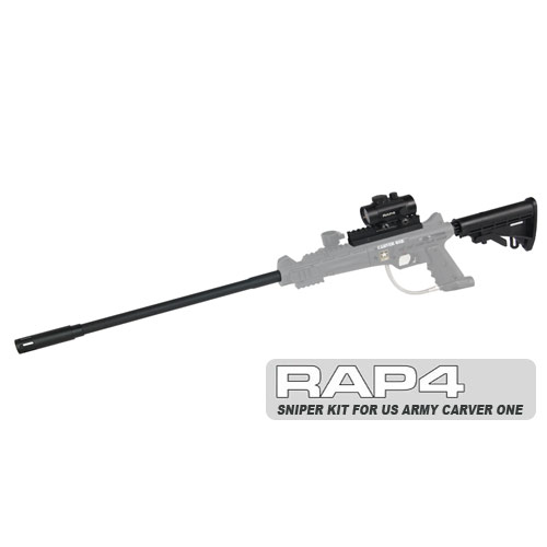 The Tippmann Carver One Paintball Gun Sniper Rifle Upgrade Parts Kit is a very easy to install mods package that converts the US Army Carver One tactical marker into long range precision sniper paintball rifle. It includes a precision 18 rifled barrel, carbine stock and optics that will help you dial in tiny details on your target.