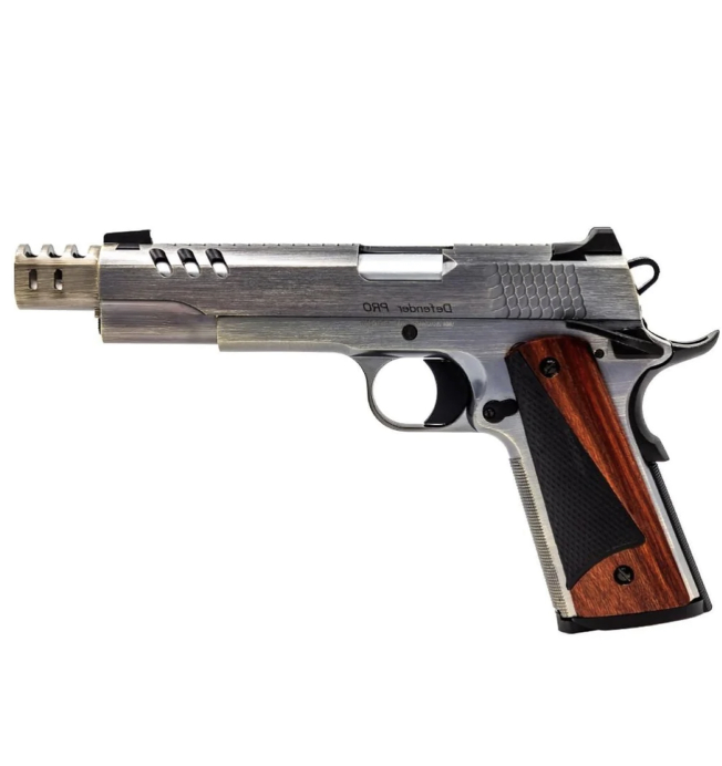 The DEFENDER PRO has an entirely new slide featuring 3 forward vent ports, a top slide ripple pattern and rippled slide grips. The design of the vent ports has been incorporated unto a new “twist and click” moderator that is very easy to remove. Included is a spare barrel bushing if it is the non-moderated look that is required. The pistol grips are a split wood/polymer construction, this leads to a striking design. Finally, a solid trigger is being used for the first time on a VORSK model.