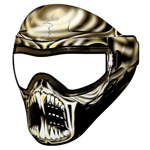 The Dope Series Warlord Alien Skull Paintball face mask comes with a military grade anti-fog and anti-scratch clear thermal lens and graphics that will make you the envy of all your friends! This high quality and top rated paintball mask is on sale here at the best possible cheap discount online sales price. ASTM rated for mask + lenses, one size fits all. This cool, scary paintball mask does not come with a Mask Stuff Bag or a Phace Mask Protectant Kit! We highly recommend these items to protect the mask graphics and the lens; please see options below if you want to add these to your order.