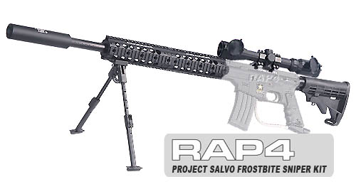 It’s easy to completely transform the look of the Project Salvo paintball machine gun with just a few cheap priced accessories. Most of these modifications are simple to install and will also make a great difference in your gun’s performance, making it more stable and accurate to shoot farther and faster. Add a new lengthy barrel, bipod and long range scope to turn the US Army Project Salvo into a precision replica sniper paintball gun!